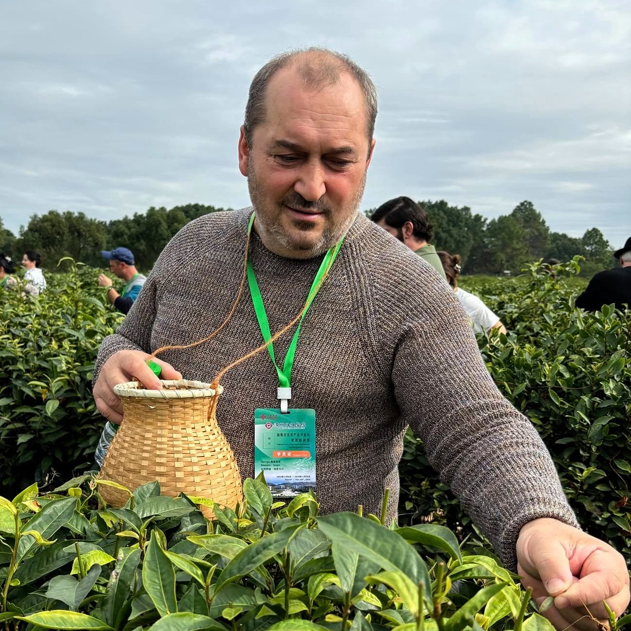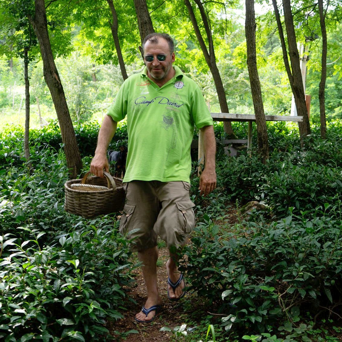Grigol with a basket of freshly picked leaf