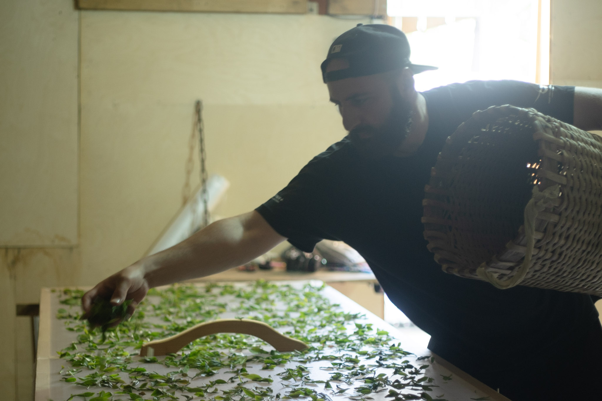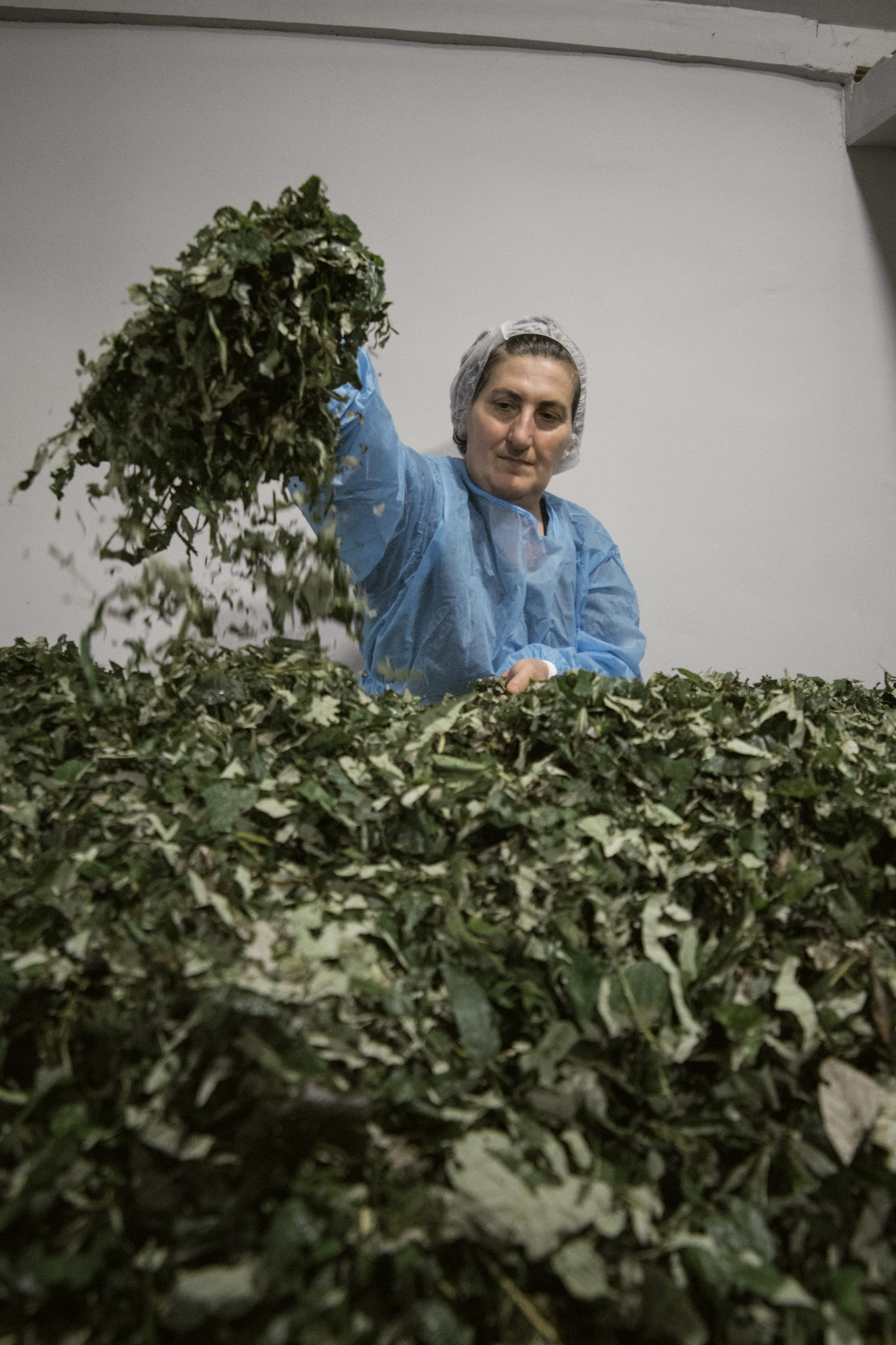 Ia sorts blackberry leaves in Shota\'s tea factory