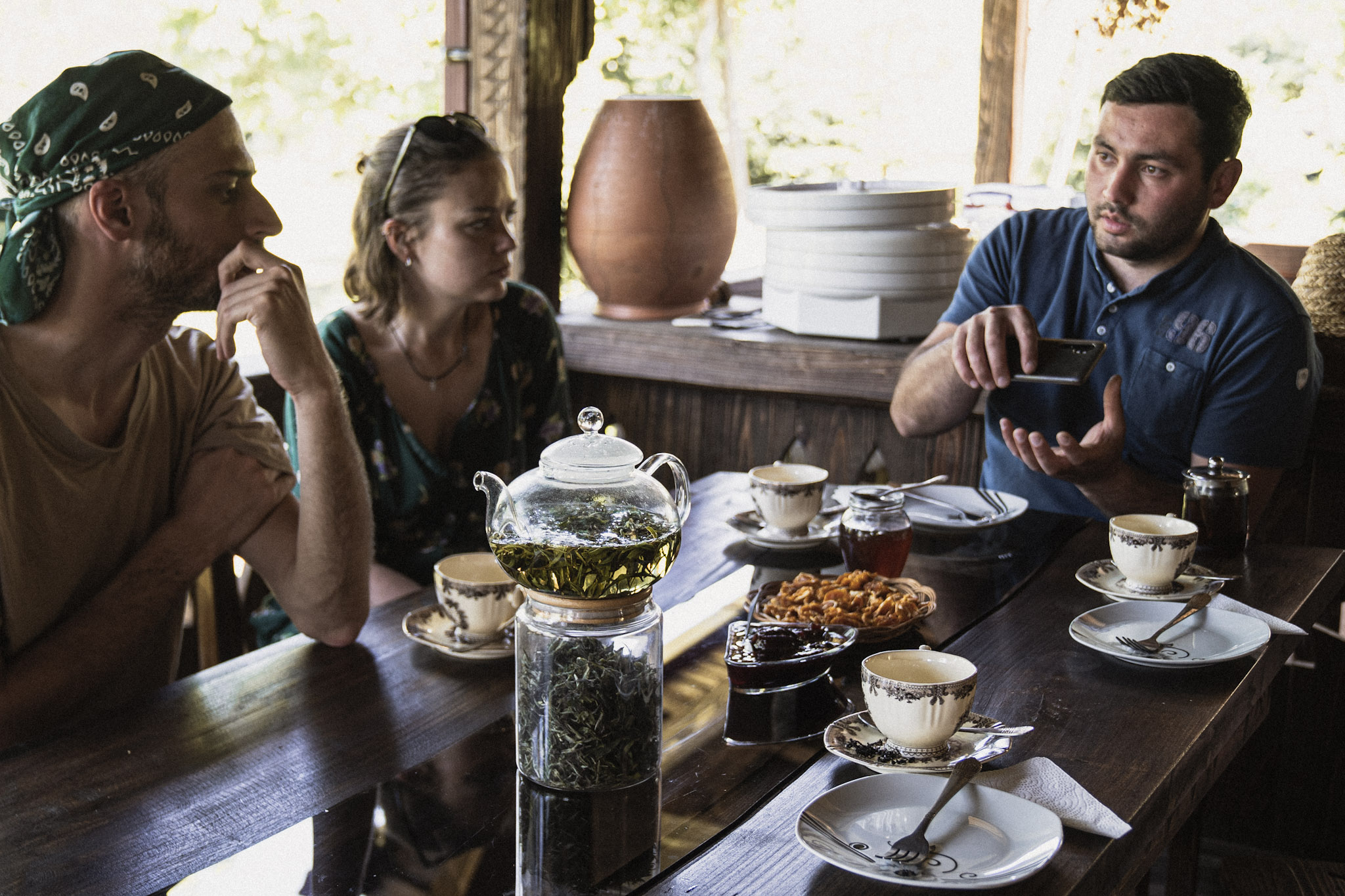 Gabriel Tenieshvili hosting Timothy Merkel and Amy Jones at a tea tasting
